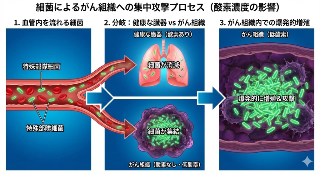 たとえるなら、「普通の兵士(抗がん剤)は砂漠(低酸素)では戦えないが、砂漠戦専用の特殊部隊(この細菌)を送り込めば、敵の本拠地で勝手に増えて勝手に壊滅させてくれる」というイメージだ。