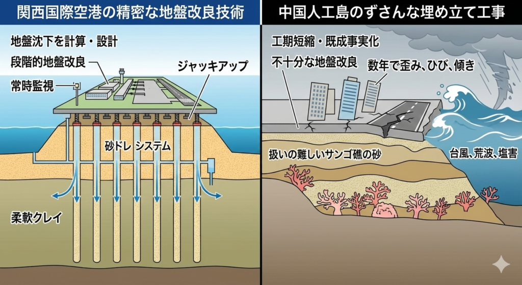 一方で、中国の人工島はどうでしょうか。 彼らが優先したのは「工期の短縮」と「既成事実化」でした。サンゴ礁の砂(切開室の砂)は非常に扱いが難しく、本来なら何年もかけて荷重試験を繰り返すべきところを、軍事拠点化を急ぐあまり、不十分な自盤改良のままコンクリートを流し込んだのです。