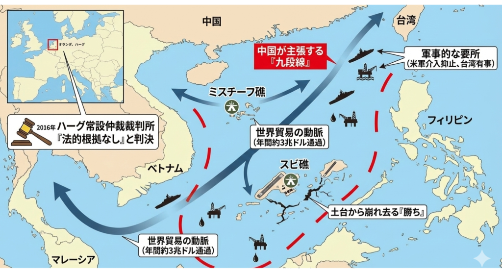 中国は、2016年にハーグの常設仲裁裁判所から「法的根拠なし」と断罪されたにもかかわらず、サンゴ礁を埋め立てて滑走路や港を強引に作り続けてきました。まさに「やったもん勝ち」の精神ですが、その「勝ち」が今、土台から崩れ去ろうとしています。