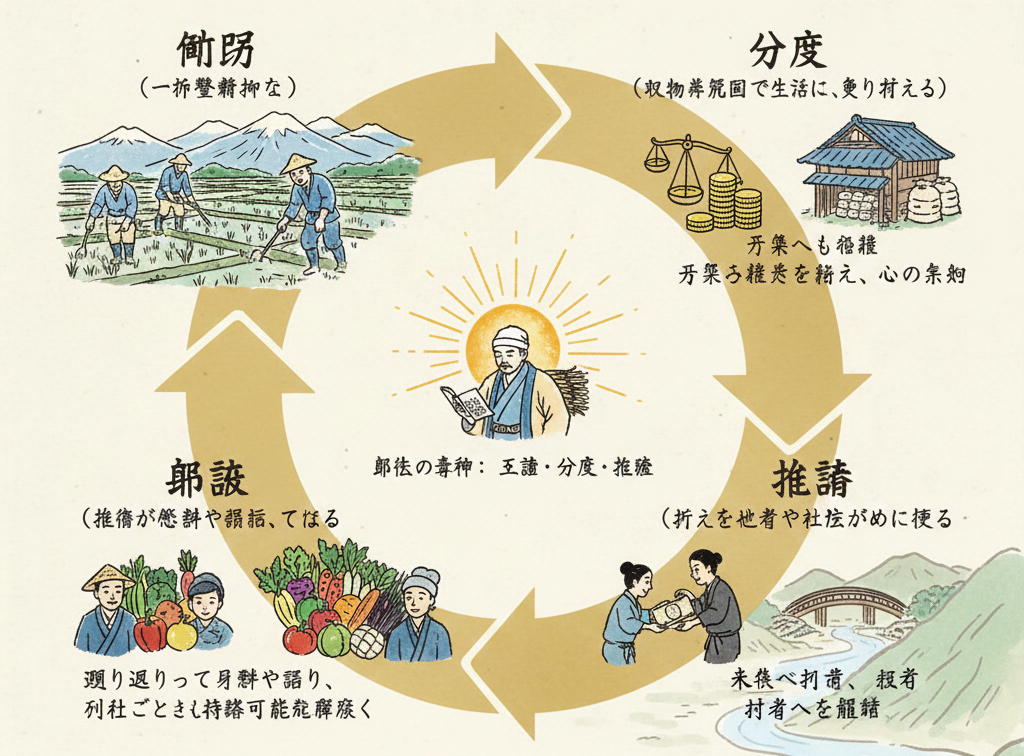 尊徳の教えの核にあるのは、自分の状況に見合った生活を送る「分度」と、余った分を他者や未来のために譲る「推譲」です。